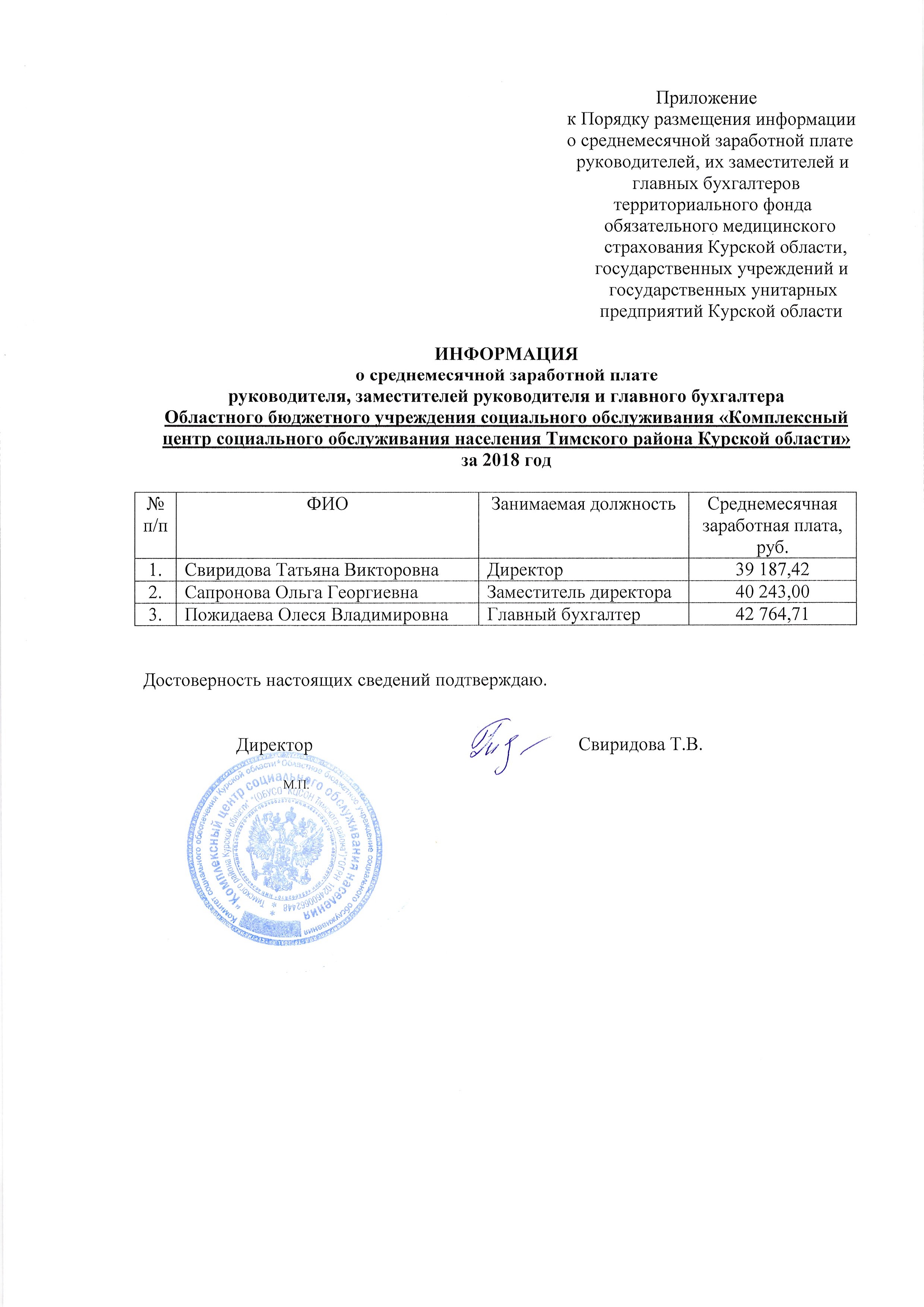 Информация о среднемесячной заработной плате руководителя, заместителей руководителя и главного бухгалтера ОБУСО «КЦСОН Тимского района» за 2018 год