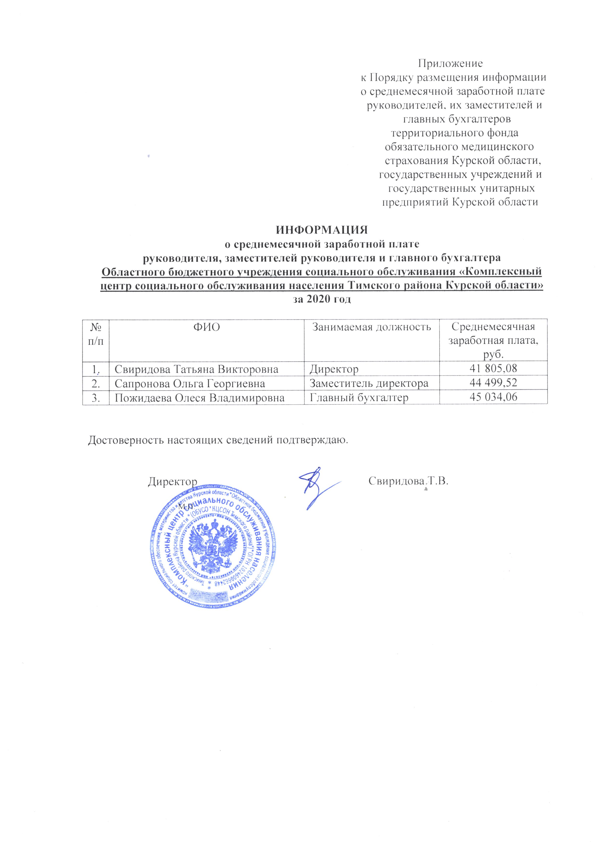 Информация о среднемесячной заработной плате руководителя, заместителей руководителя и главного бухгалтера ОБУСО «КЦСОН Тимского района» за 2020 год