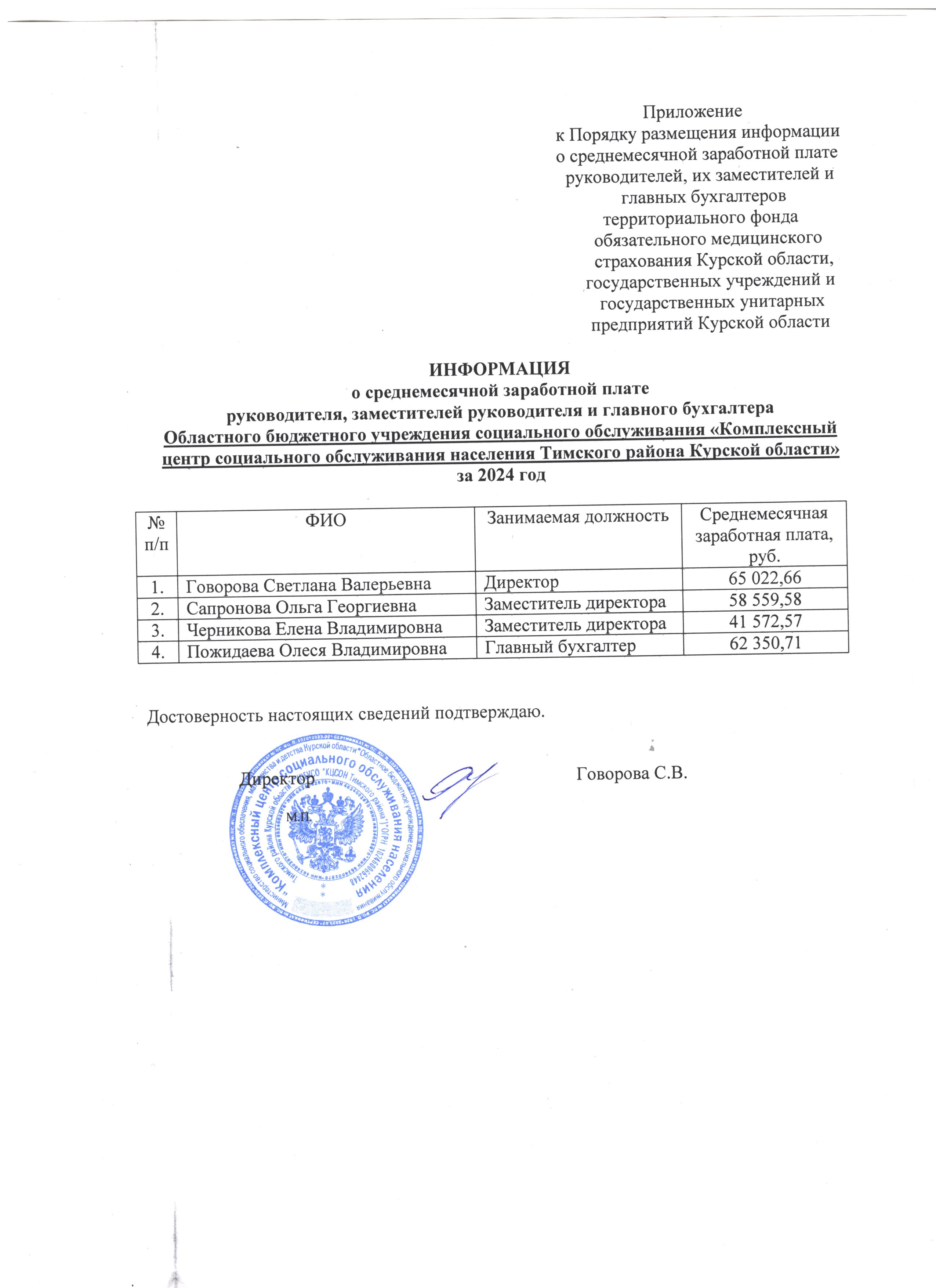 Информация о среднемесячной заработной плате руководителя, заместителей руководителя и главного бухгалтера ОБУСО «КЦСОН Тимского района» за 2024 год